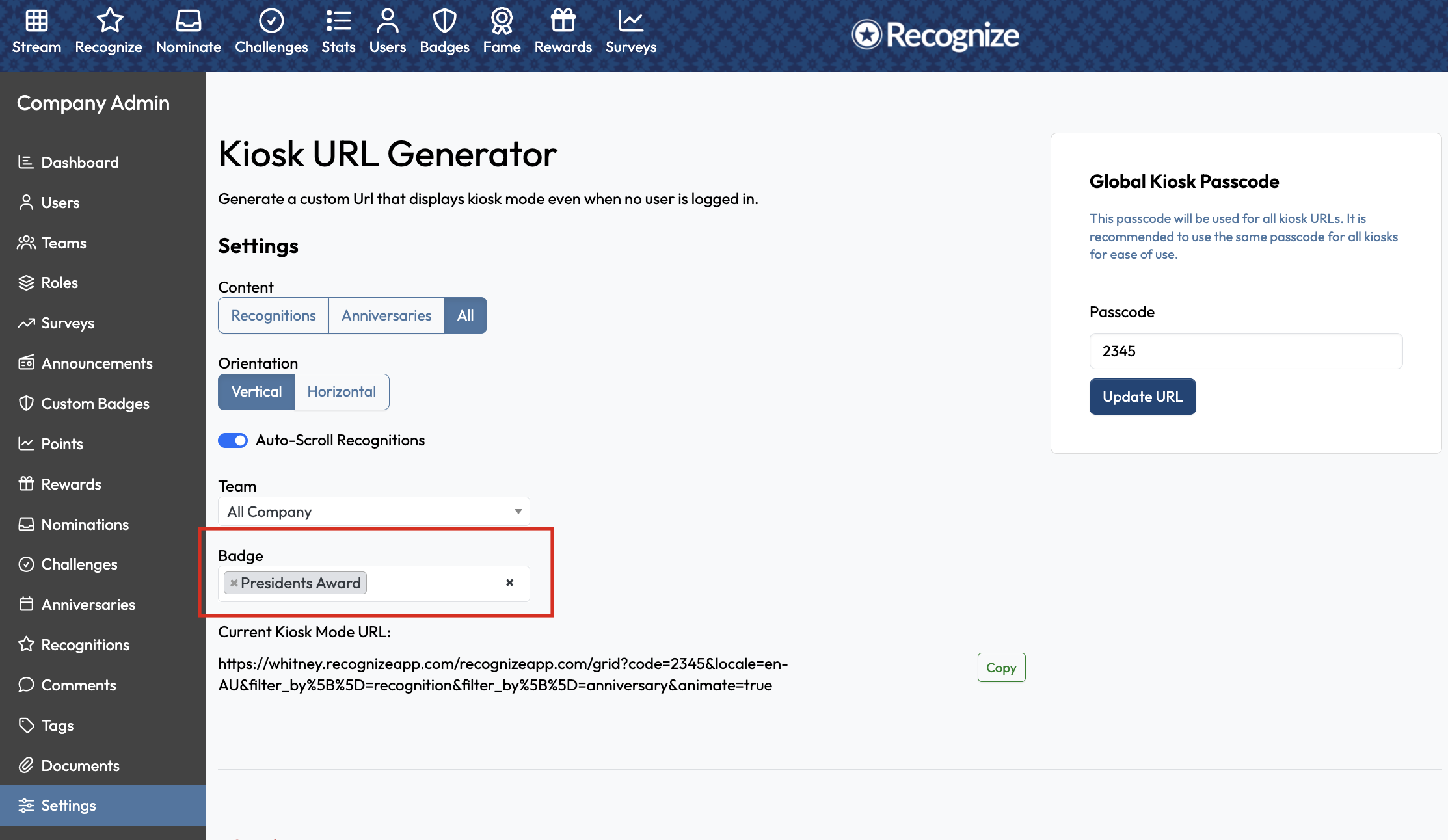Kiosk Mode can now be filtered by a single badge, helping teams highlight specific recognition moments or campaigns on shared screens. This makes recognition displays more intentional and aligned with current priorities.